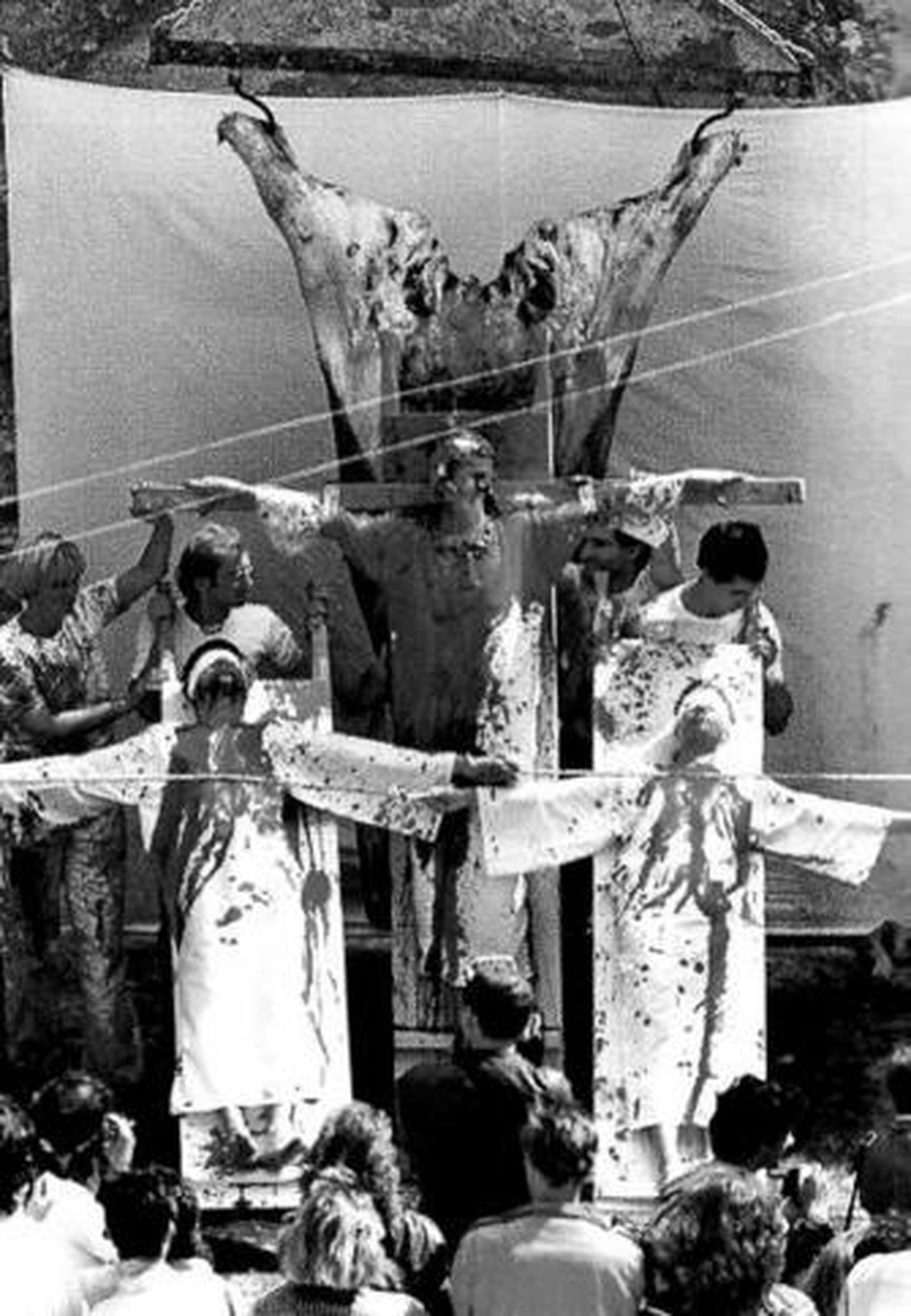 Sobre ello, el Accionismo Vienés, en sus más conspicuos representantes: Otto Mühl, Günter Bruss, Hermann Nistsch y Rudolf Schwarzkogler, ofrece un marcado interés por lo ritual, primitivo y orgiástico. Así, Mühl, lleva a cabo una serie de "actuaciones-destrucciones" sobre el cuerpo femenino. Exaltación del sexo, de la vida y de la muerte, que son particularmente espectaculares en las "acciones" consagradas por Nitsch en su castillo de Prinzendorf, en la Austria Inferior, dentro de los actos del Orgien Mysterien Theater. Uniendo sin complejos, como pre-cristiano, sexo y religión, realiza unos rituales que comportan crucifixiones y sacrificios de animales. Sangre y vísceras que hacía chorrear sobre los desnudos neófitos, con una, si cabe "preocupación cromática": manchar de rojo-sangre telas y hábitos blancos. En la antigüedad, a ello, se le llamaba taurobolio. Lo que venía a ser un acto vanguardista, no era sino actualización de un rito ancestral. Una especie de bramido desesperado que busca el corazón más puro ajeno al racionalismo civilizatorio.