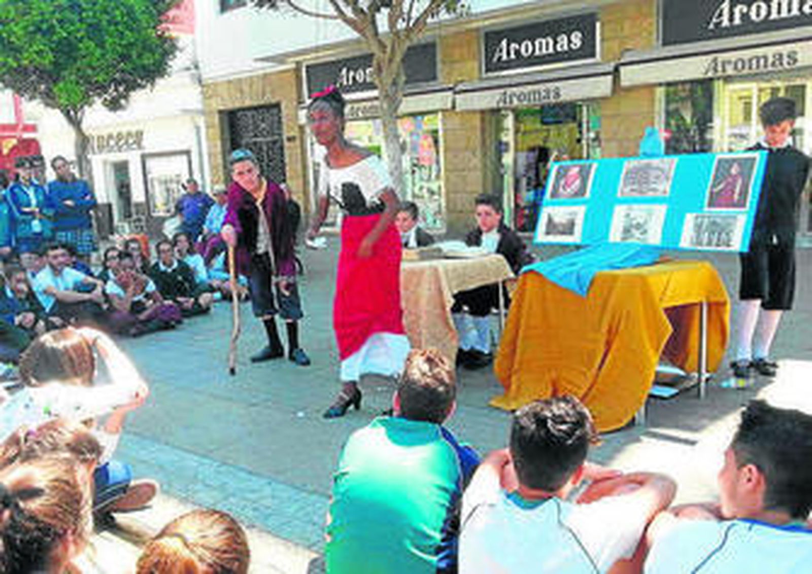 Rodeados de compañeros de Las Carmelitas, de padres que se acercaron a ver el espectáculo y de isleños que paseaban por la calle Real, en las inmediaciones de la plaza del Rey y de la plaza de la Iglesia, un grupo de alumnos mostraron a los presentes algunos de los pasajes más reconocibles de El Quijote, de Miguel de Cervantes, sobre el que también declamaron acerca de su vida y obra. La atención de los espectadores, adultos y algunos niños curiosos, se reflejaba en las sonrisas y en las risas que arrancaban las escenas teatralizadas que este centro educativo sacó a la calle. Nada mejor, en estos días que se conmemora el 400 aniversario de la muerte del genial escritor, que poner a Cervantes en la plazas.