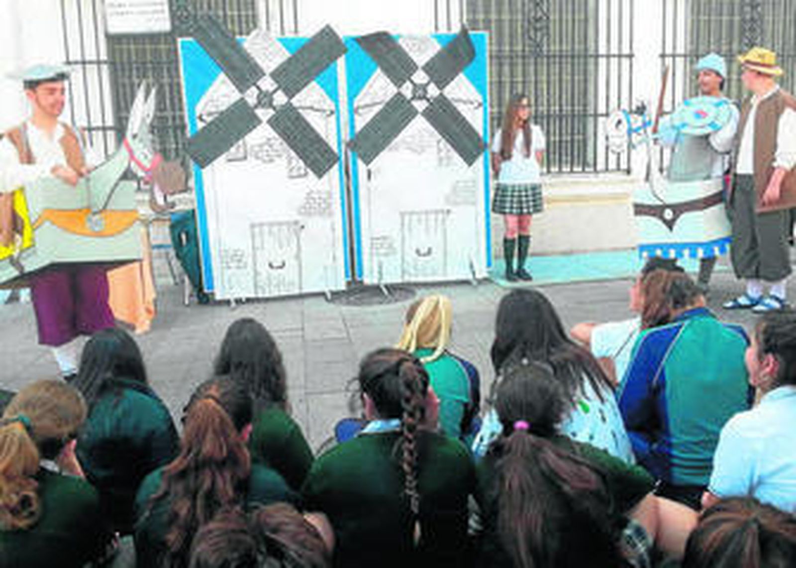 Ayer en la plaza de la Iglesia parte del grupo ofreció episodios de sobra conocidos por el público: el momento en que arman caballero a Don Quijote, la batalla de los molinos, el yelmo de Mambrino, la liberación de los galeotes. "Sirven además para mostrar algunos de los valores que se muestran en la obra, como la lealtad", apunta Merche. Para la representación los alumnos se valen de una compañera que hace las veces de narradora para explicar cada situación, y en cada escena de las vestimentas y del atrezzo que permitía al público viajar a la época. Mientras las ropas son el legado de otras actividades, que han ido guardando para posibles futuros usos, la armadura, la lanza o los caballos son elementos elaborados por la Asociación de Madres y Padres de Alumnos (Ampa) para esta ocasión. "Tenemos que darles las gracias", reconocía esta docente del seminario de Lengua y Literatura de Las Carmelitas. Como equino se habían servido de unas cajas pintadas a modo de cuerpo y cartón para dibujar las cabezas.