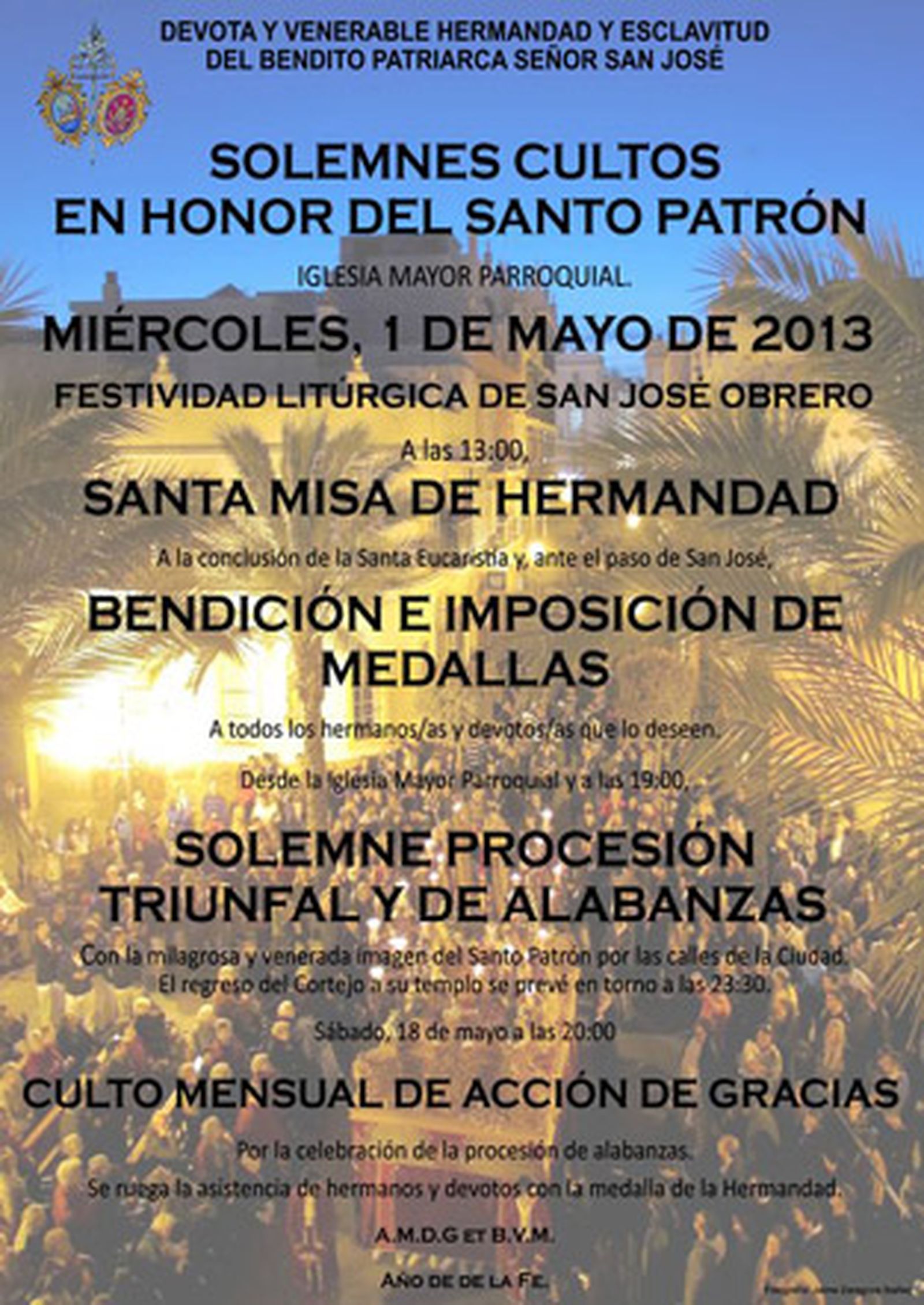 La Esclavitud de San José tiene previsto una serie de actos y cultos para conmemorar la Festividad de San José Obrero