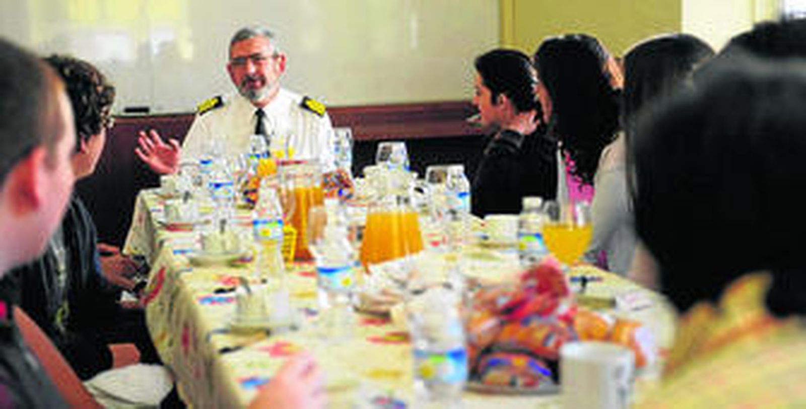 Un civil y tres militares, todos licenciados universitarios, dos de ellos además doctores, fueron los encargados de atender a estos alumnos durante el desayuno de trabajo, como Belizón definió la cita de ayer. José Luis Muiños Haro, jefe de la sección de Astronomía, habló a uno de los grupos de astronomía. El capitán de navío Juan Palacio Rodríguez, jefe de la sección de Hora, departió con los alumnos sobre tiempo y frecuencia. El capitán de navío Teodoro López Moratalla, jefe de la sección de Efemérides, se refirió a las efemérides astronómicas y la navegación astronómica. Por último, el capitán de fragata Antonio Pazos García, jefe del departamento de Sismología, dialogó sobre este área con los estudiantes.