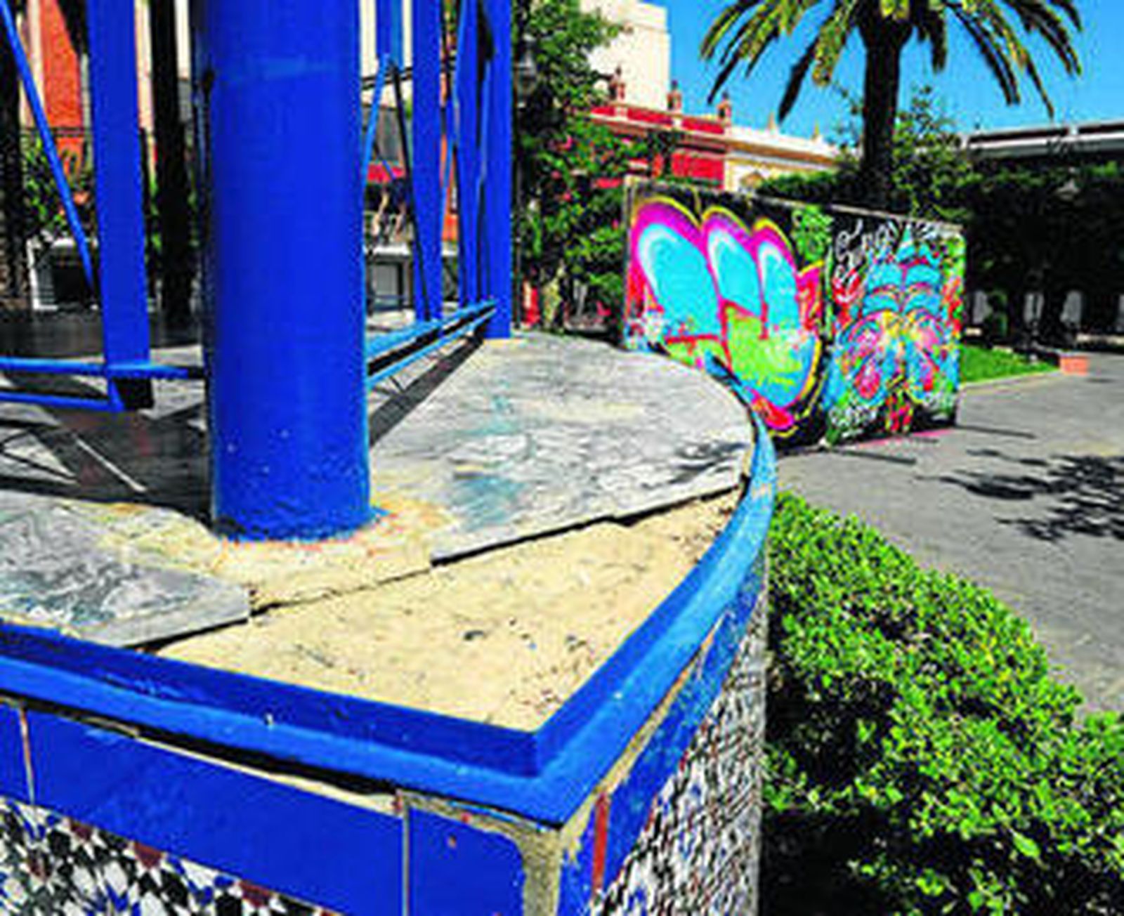 Pero no sólo las casas, también los bancos, los pocos que sobrevivieron a la reforma que sufrió la plaza con la obra del tranvía, amanecen cada día más deteriorados. Azulejos rotos o simplemente inexistentes. Los de decoración cerámica que se disponen en torno al templete así como ésta última construcción presentan claras marcas del mal uso que hacen los chavales con sus monopatines cada día. Muchos bancos de forja sufren, por su parte, la fractura de sus decimonónicos respaldos que, en algunos casos, carecen de apoyabrazos.