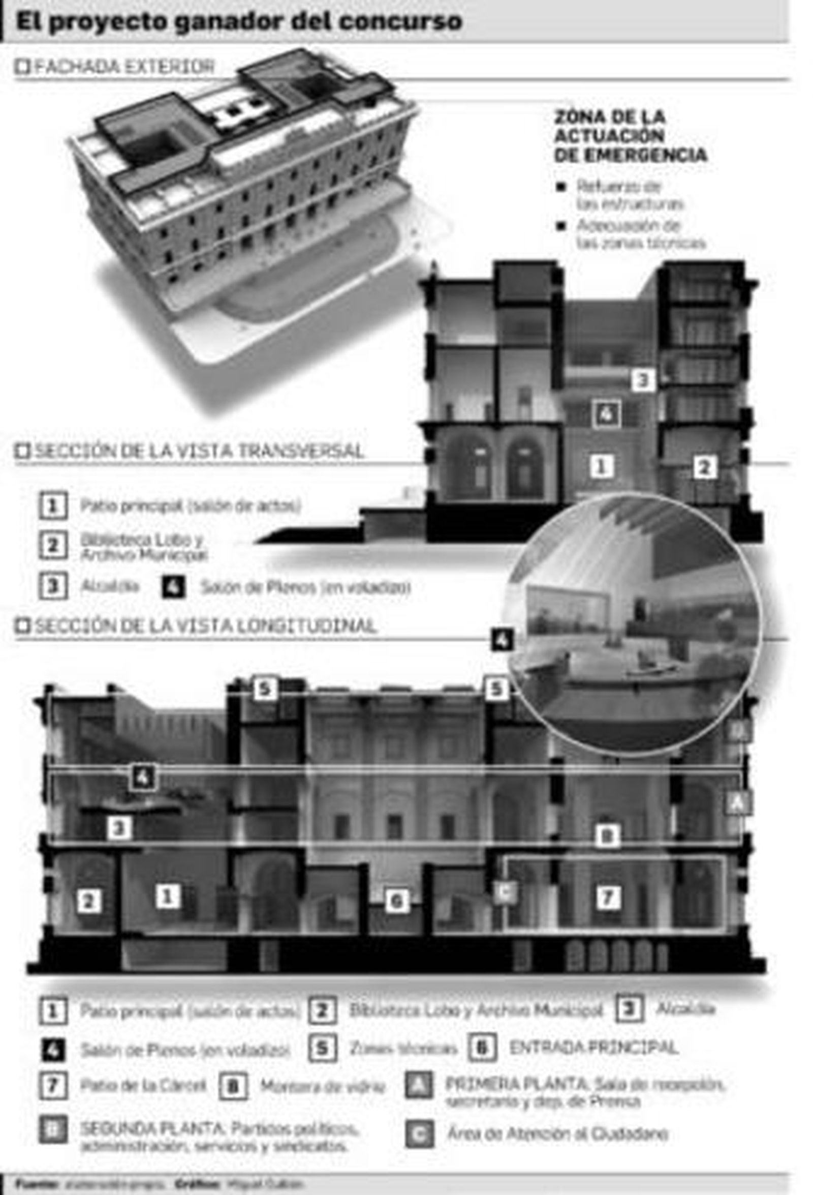 La última revisión del proyecto de rehabilitación, según pudo saber este periódico, abarata los costes en más de un millón de euros (cabe recordar que el proyecto fue revisado en 2010 para afrontar ya una sustancial rebaja) y divide la intervención en tres fases de ejecución, que permitirían -tal y como quiere Loaiza- que el Ayuntamiento pueda empezar a ser utilizado a medida que se van cumpliendo hitos de la obra y ajustar la actuación a la realidad económica de la Administración. Los trabajos -es algo que a nadie se le escapa- tardarán varios años en llevarse a cabo dada su magnitud.