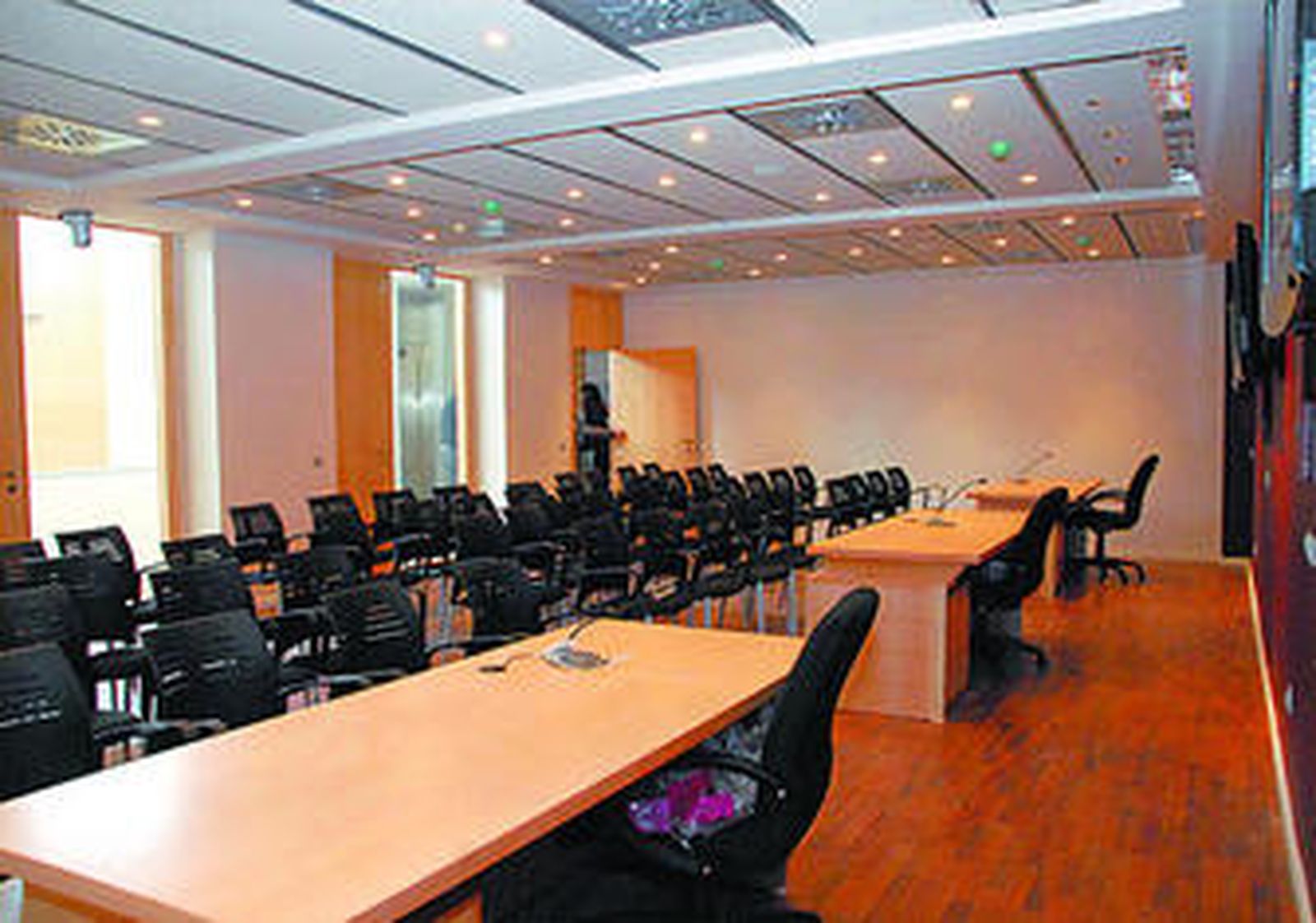 Unas pequeñas escaleras conducen al ascensor y la primera de las estancias de la parte trasera, más estrecha. En esta parte se instalará el personal de oficina. Justo antes, a la derecha, la primera de las tres salas que, planta a planta, servirán para realizar conferencias, congresos y reuniones. La de ésta se denomina sala Parlamento y la de las superiores, sala Bicentenario 2010 y sala Duque de Alburquerque. Todas ellas se han construido utilizando un desnivel gradual en la colocación de los asientos, a modo de anfiteatro, alrededor de una mesa con ordenadores propios. A su espalda, un proyector.