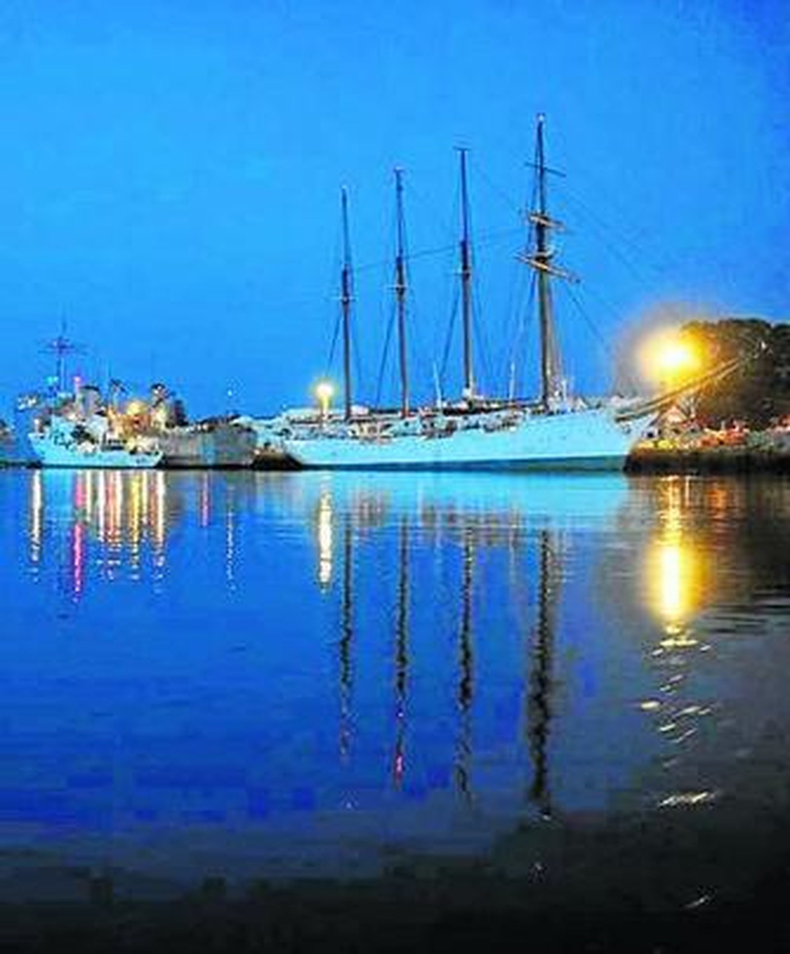 Junto al Elcano puede apreciarse la silueta de Puerto Real, pero el barco gira hacia su izquierda, o hacia babor que dirían los marineros, el camino sigue hacia el sol que a esas horas no es más que un disco anaranjado al que se puede mirar directamente sin quedar cegado al instante. Es una buena imagen que los turistas aprovechan para fotografiar al astro rey y al cielo que poco a poco va oscureciéndose.