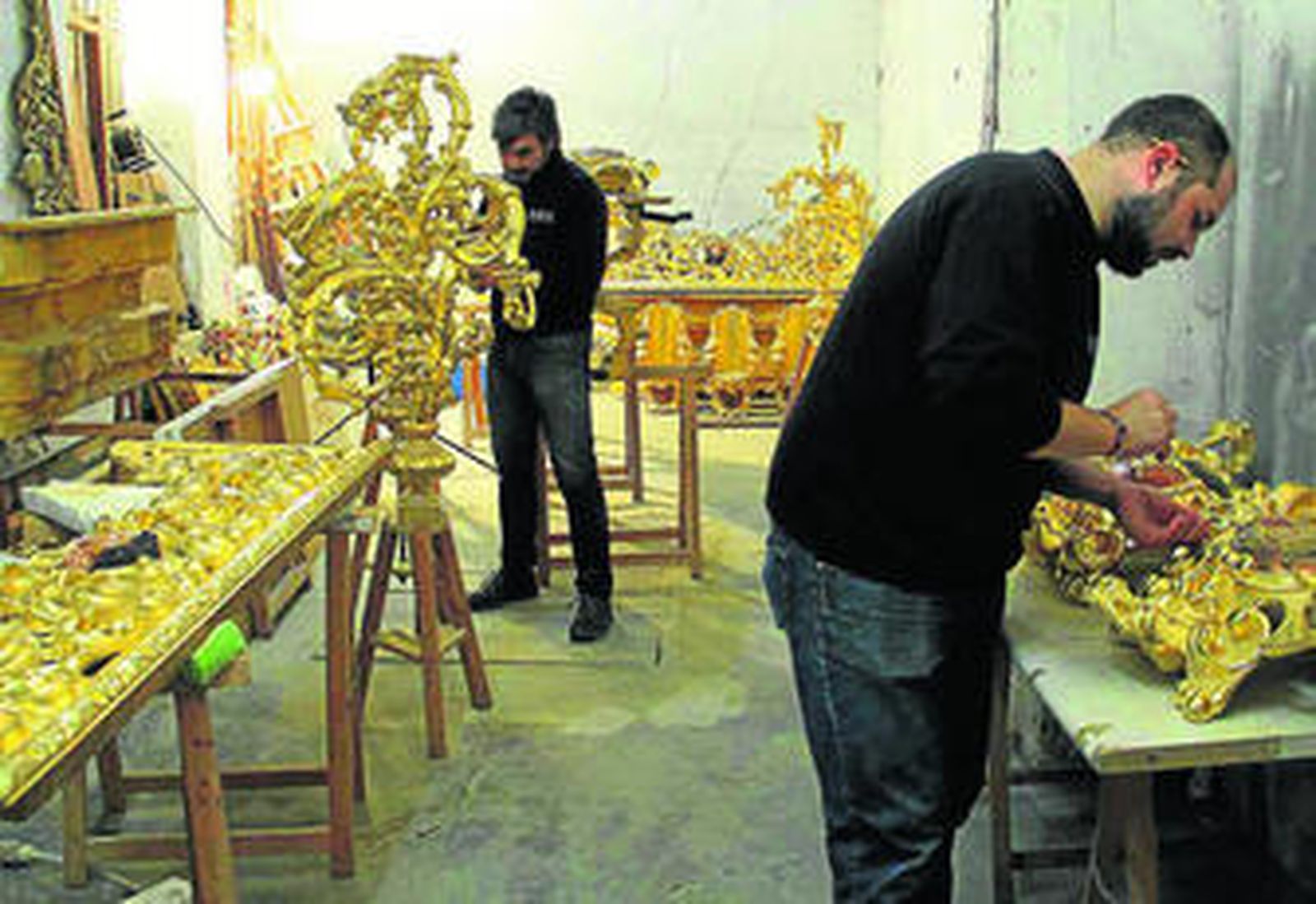 En el mundo de las cofradías hay dos cuaresmas. Una Cuaresma que es la visible, la de los cultos, la de la entrega de túnicas en las casas de hermandad, la del trasiego de los montajes y desmontajes, la de los ensayos de las cuadrillas o de las bandas... Y otra Cuaresma que al mismo tiempo discurre de manera frenética en los pequeños talleres donde los artesanos de la Semana Santa dan forma a los estrenos que luego se verán en la calle en esos días grandes. Las semanas previas al Domingo de Ramos son de alta intensidad en estos espacios donde la tradición y el arte se dan la mano para crear, o recuperar, esas obras de arte que luego se contemplan en las calles durante las procesiones. Los encargos realizados por las mayordomías de las hermandades tienen que entregarse antes de Semana Santa. Y las 24 horas del día ya no son suficientes en este tiempo de Cuaresma.