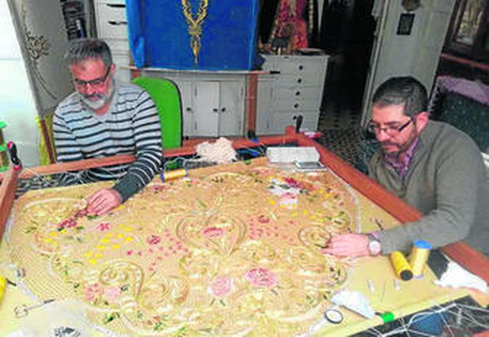 En este taller, donde Juan Carlos Romero trabaja con Francisco Javier Piñero, están bordando una toca para Cartagena y un bacalao para un pueblo de Granada, además de empezar a trabajar en la restauración del manto de Desconsuelos, de la cofradía de Afligidos (aunque esta última pieza no será para Semana Santa, sino que se pretende estrenar en diciembre).