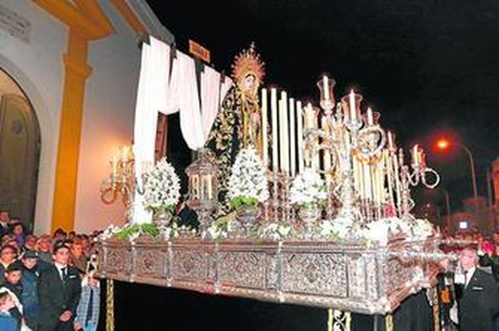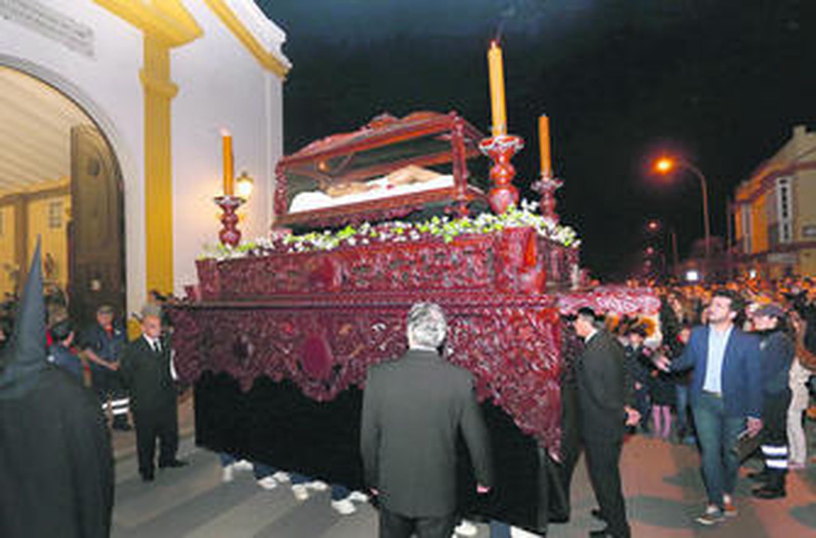 La seriedad y la formalidad resaltaban mientras la imagen del Cristo Yacente en su sepulcro, portado este año por la Peña de Costaleros La Ilusión, realizaba su recorrido en completo silencio. Por su lado, la figura de Nuestra Señora de la Soledad expresaba su dolor por la muerte de su hijo ante la mirada de numerosas personas.