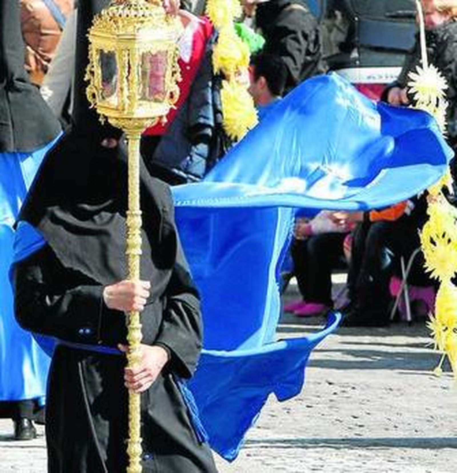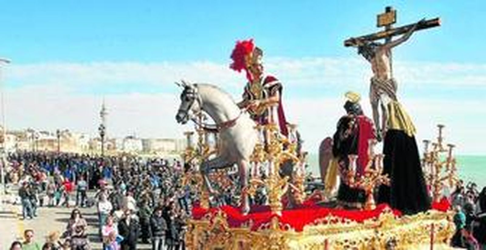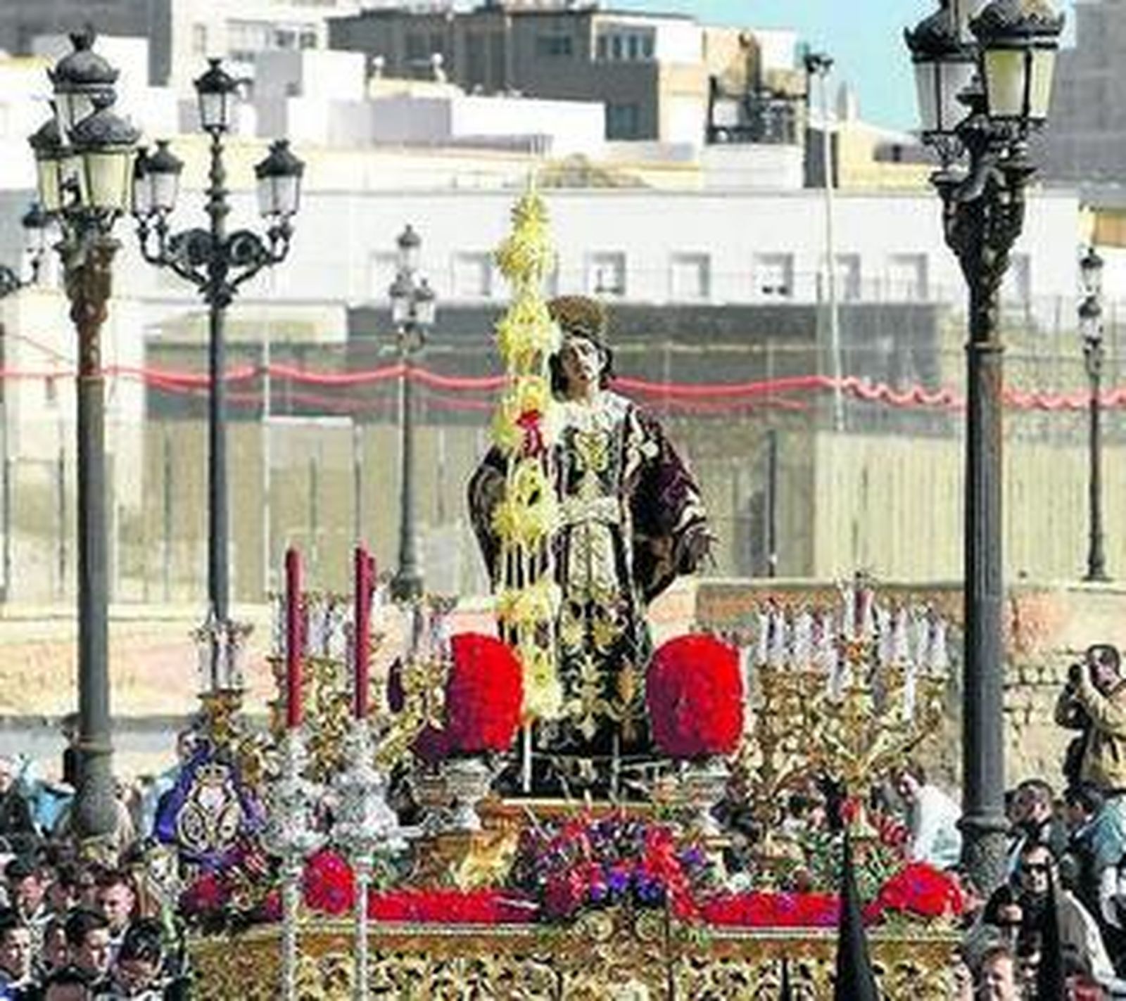 Las maniobras de los pasos para salvar la puerta de Santa Cruz, alguno con mayor dificultad, daban paso al sol de la tarde en la plaza, desde donde se podían apreciar los detalles del paso de misterio (como eran las rosas que florecían del cáliz del ángel o la carabela del monte, a los pies del Crucificado) o el espléndido palio de la Virgen de la Luz, con un destacado exorno floral.