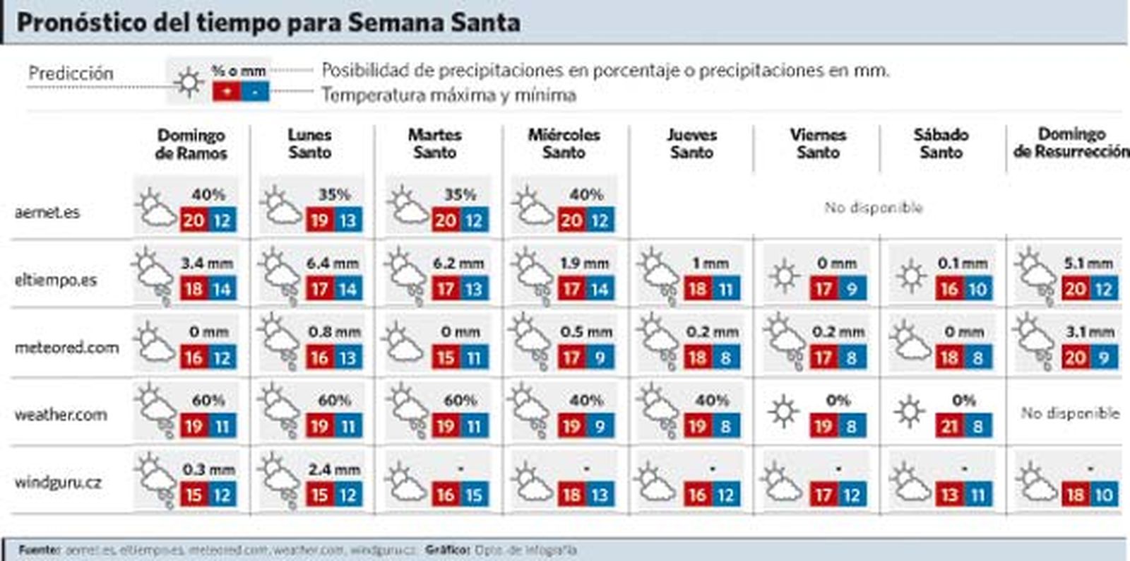 Por su parte, Weather coincidía con eltiempo.es y anunciaba anoche chubascos hasta el Jueves Santo (con probabilidades del 60% para los tres primeros días de la Semana Santa y de un 40% para Miércoles y Jueves), con un Viernes Santo soleado y un Sábado Santo parcialmente nublado.