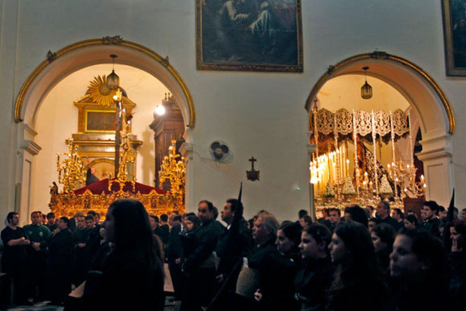 A las seis y media de la tarde, cuando por la plaza de San Francisco pasaba la cofradía del Prendimiento, los hermanos que iban a procesionar llegaban al templo seráfico y por orden de antigüedad pasaban a ocupar el lugar asignado a cada uno de ellos en los banccos de la iglesia.