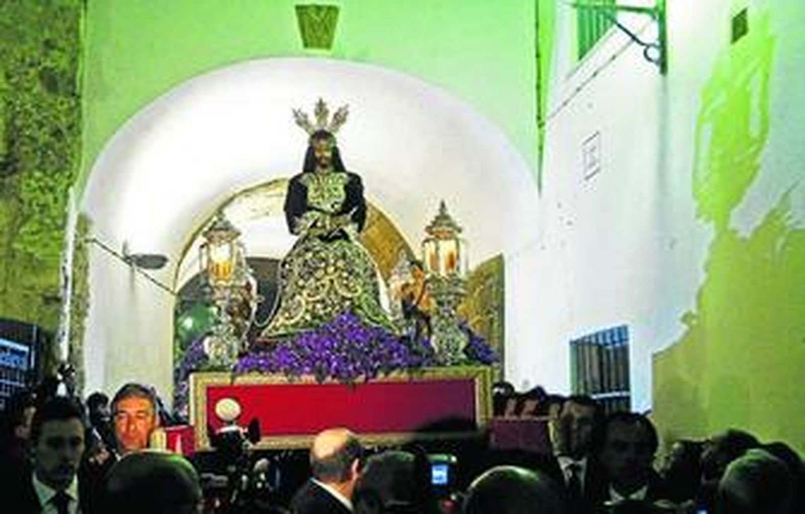 Cigarreras protagonizaba ayer el vía crucis de las hermandades. Y la corporación de Santo Domingo entendió a la perfección lo que significa ser la imagen elegida para este evento. El Señor de la Salud se presentaba ante Cádiz de una manera para nada habitual. En una parihuela (cedida por la Tertulia Cofrade Al Palo) en lugar del paso de misterio; sin el resto de imágenes secundarias; con una túnica bordada en plata que hacía años que no vestía y que ha restaurado Miguel Ángel Franco aprovechando este acto y el centenario fundacional de la hermandad; escoltado por cuatro faroles (de la hermandad de Borriquita) y exornado con lirios color morado. Y además, la hermandad había establecido unos itinerarios -en parte obligada por las obras de la plaza de San Juan de Dios- también del todo inusuales.