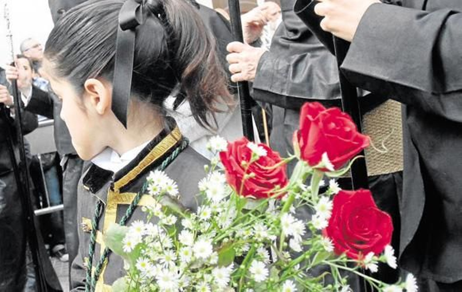 · Entre la cruz de guía y los cuatro cirios se ubican dos niñas vestidas a la federica, cada una con un ramo de rosas rojas que en la Santa Iglesia Catedral depositan ante las imágenes de los patronos de Cádiz, San Servando y San Germán. El hermano mayor de la hermandad de estos santos les recibe en el interior de la Seo.