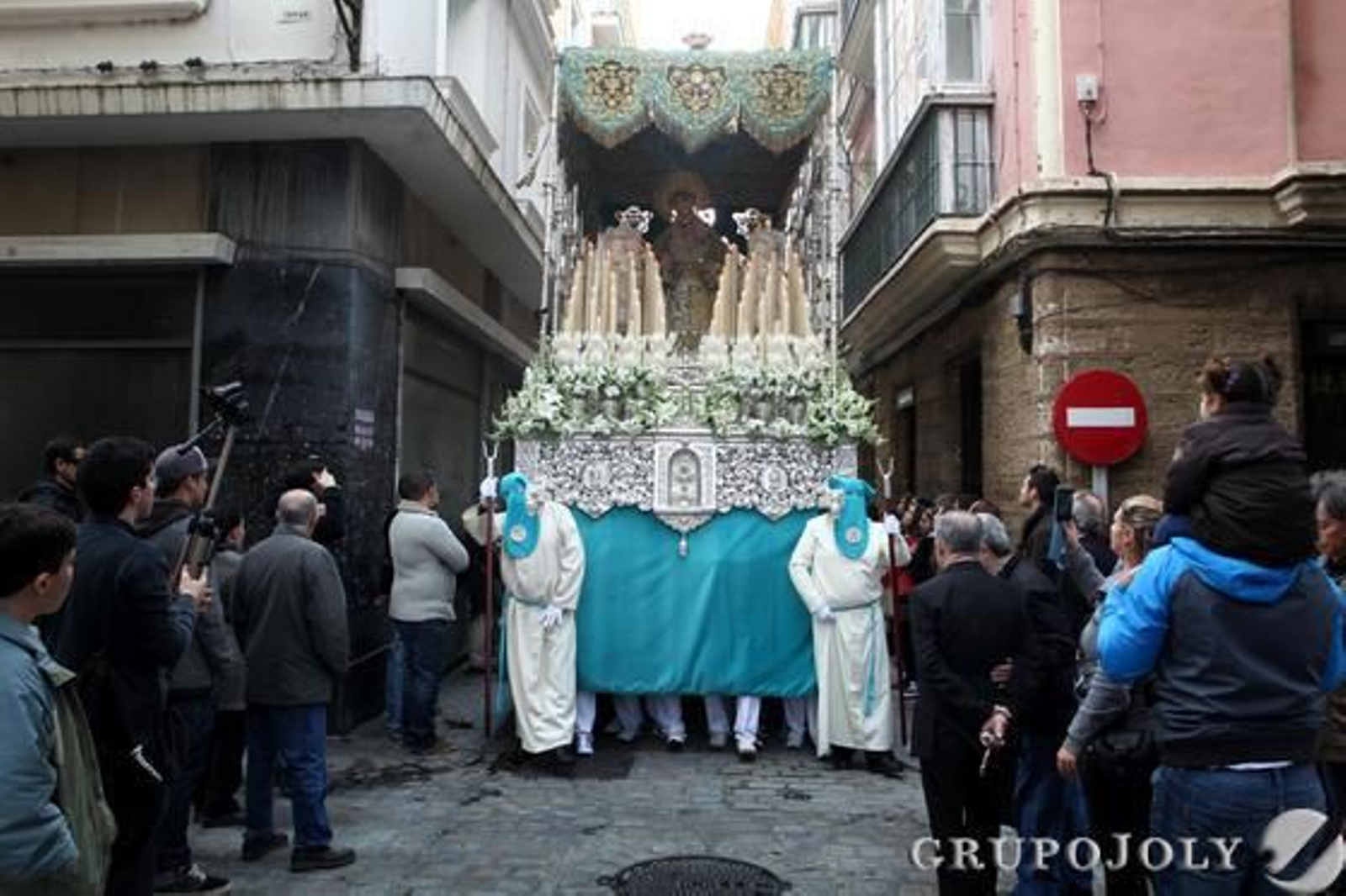 Después fueron saliendo los penitentes que acompañaban a la Virgen del Patrocinio, a los que se unía un grupo de pequeños monaguillos, formando en la presidencia el padre Gerardo, Antonio Verdía y una representación de la archicofradía del Carmen. A punto de salir el paso de palio, su capataz, Francisco García Palo, motivo a sus cargadores diciéndoles "Cádiz no está esperando" , y ya en la calle la banda de música filarmónica de Conil estrenó la marcha María Santísima del Patrocinio. La cofradía ya estaba en la calle después de haber vivido unos meses muy complicados que había puesto incluso en riesgo la propia salida procesional.