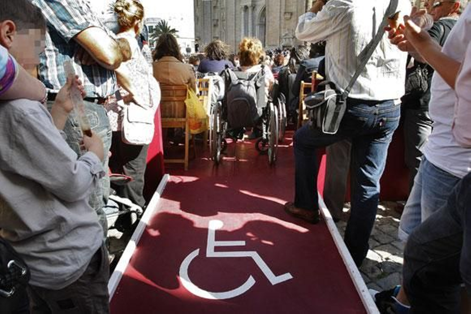 Miembros de la Asociación de Espina Bífida e Hidrocefalia estrenan el espacio que se les ha reservado por primera vez para que disfruten sin dificultades de la Semana Santa